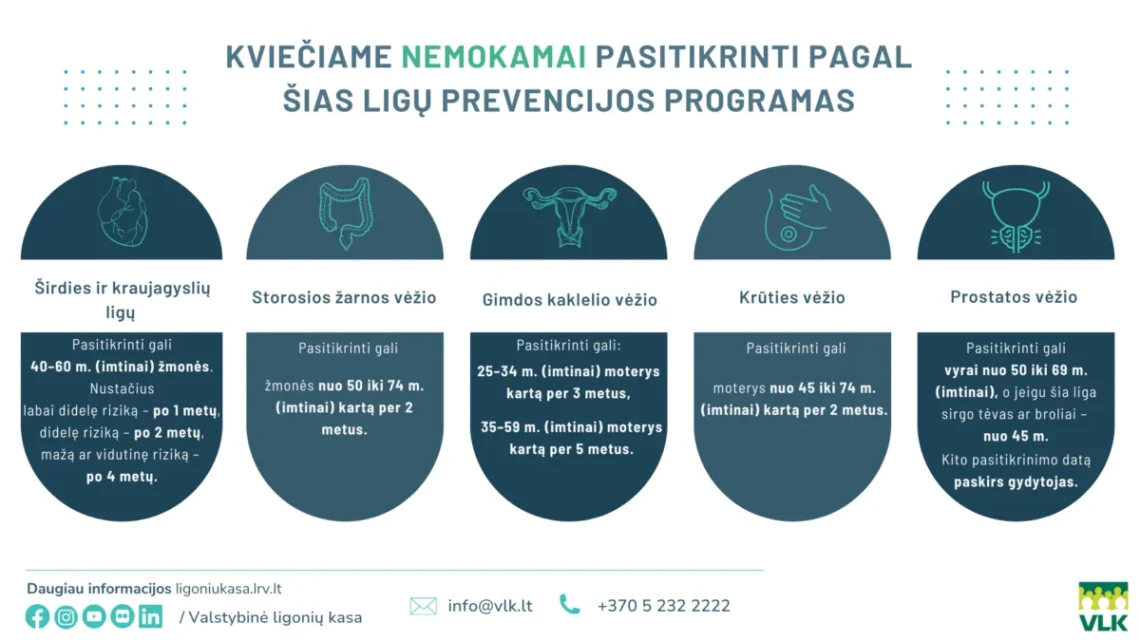 „Vis dar gajus požiūris, kad tikrintis verta tik pajutus simptomus, yra klaidingas – ankstyvosiose ligos stadijose žmogus dažniausiai nejaučia jokių požymių. Todėl labai svarbu neatidėlioti ir pasinaudoti galimybe pasitikrinti net ir jaučiantis gerai. Reguliari patikra leidžia ne tik sumažinti sudėtingo gydymo riziką, jei jo prireiks, bet ir išsaugoti gerą gyvenimo kokybę. Prevencija prasideda nuo atsakingo sprendimo rūpintis savo sveikata šiandien“, – sako Jurgita Grigarienė, VLK Paslaugų kompensavimo skyriaus patarėja.